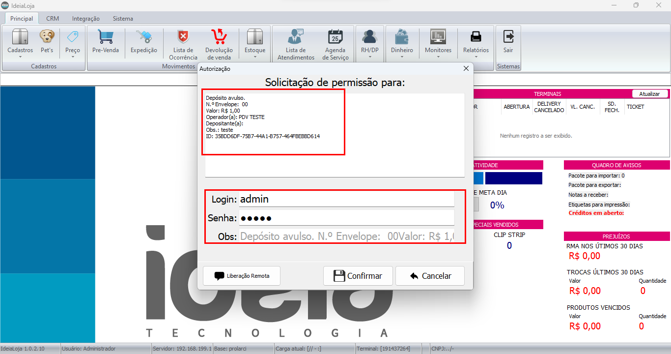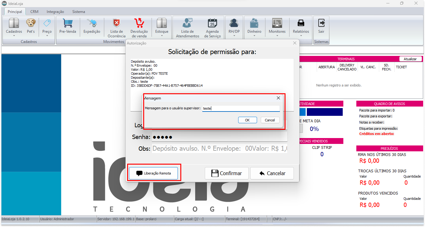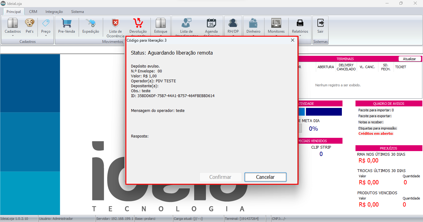 Caso não necessite da liberação remota clique em confirmar para prosseguir ou cancelar para cancelar a operação.