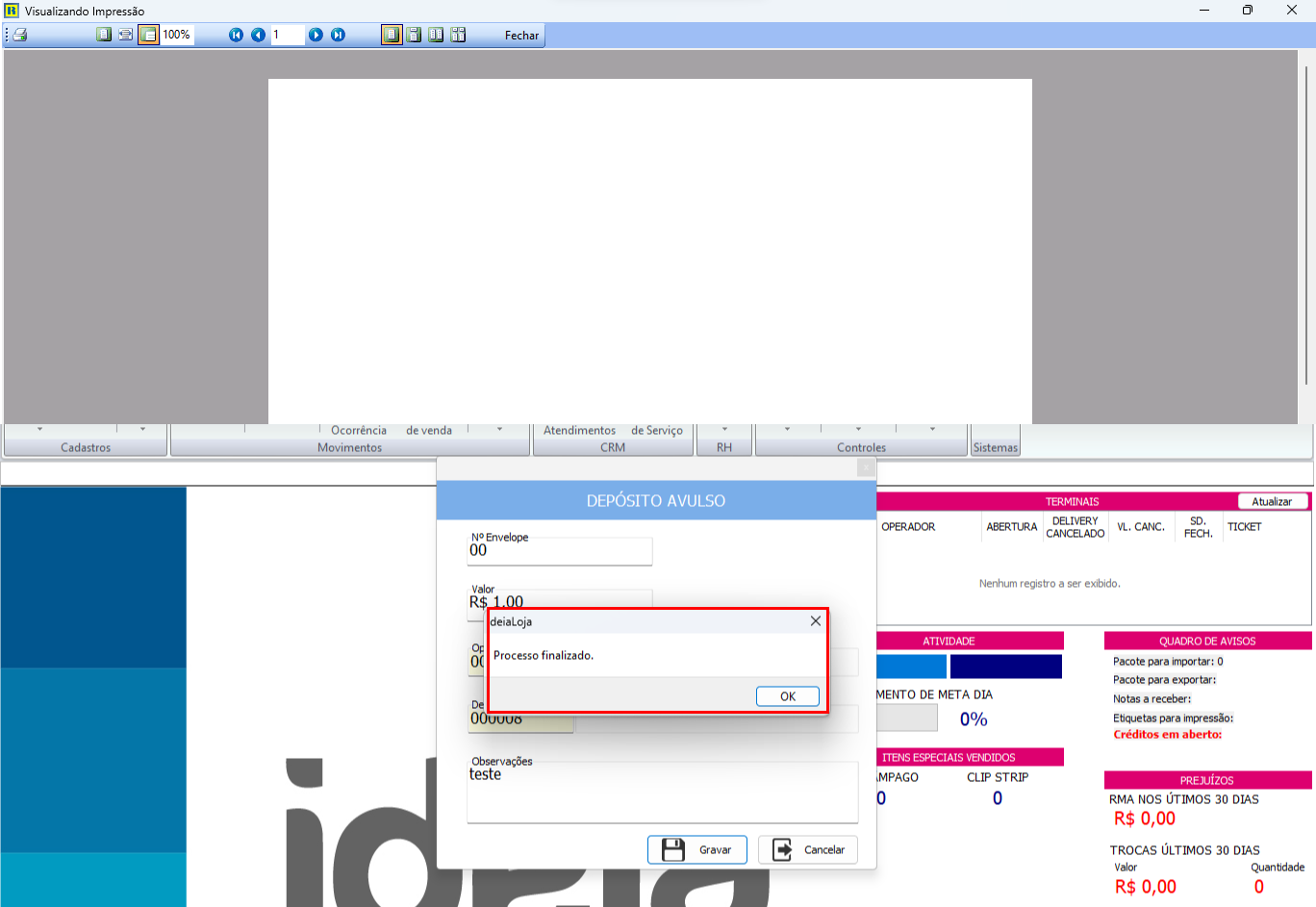 Após confirmar será exibida uma tela para visualização de impressão, ao fechar essa tela aparecera a mensagem processo finalizado