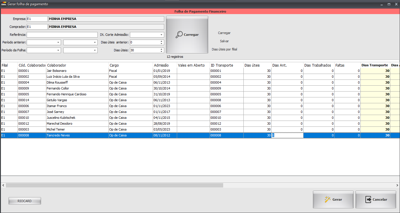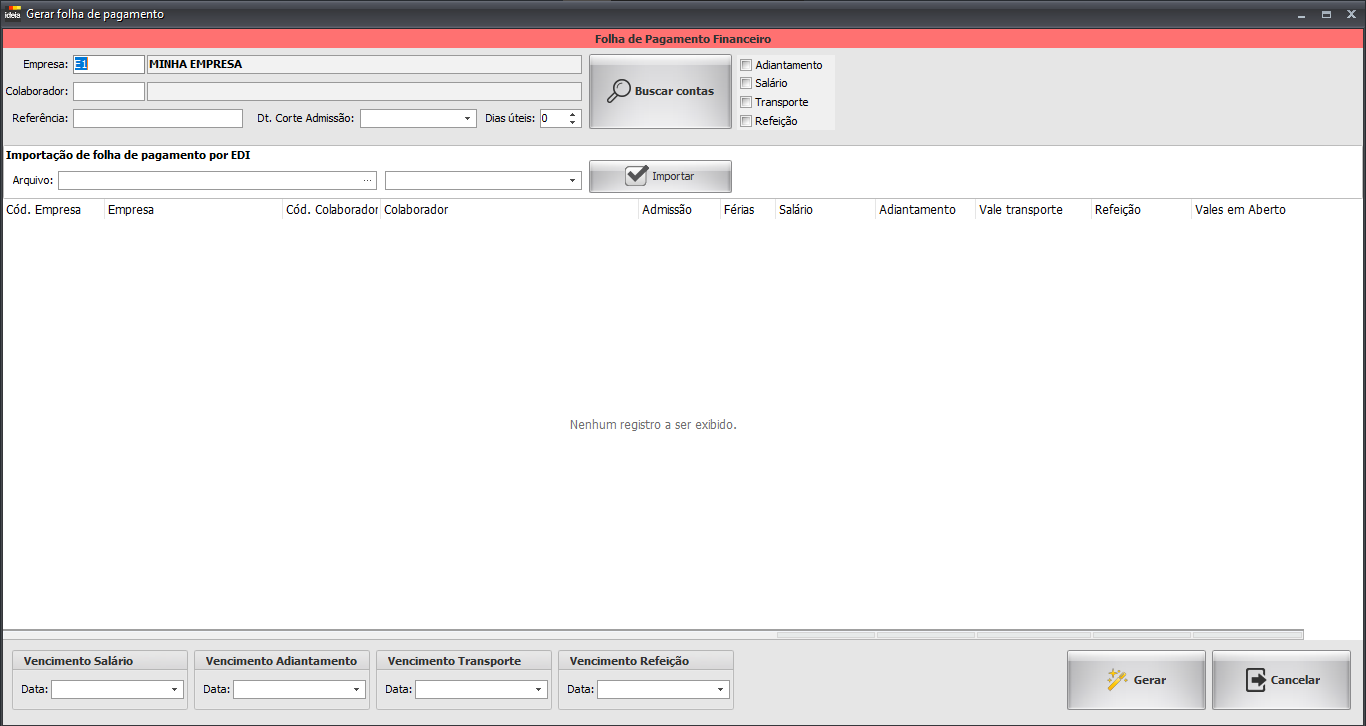 • Gerar: Aplica tudo realizado e salva a folha de pagamento.
