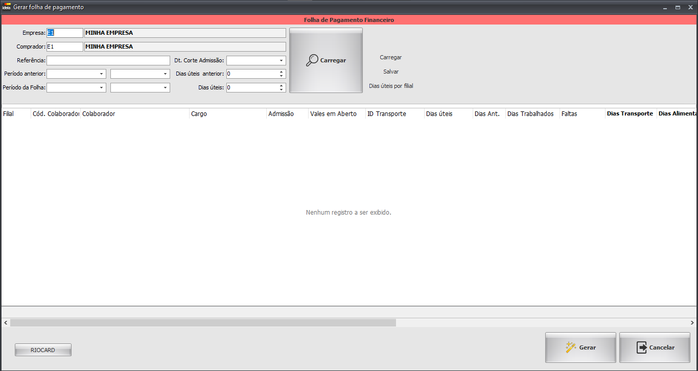 • Gerar Pedido RioCard: Botão que gera o pedido de compra do Rio Card dos colaboradores, podendo ser definido por geral ou por filial. O arquivo gerado irá ser armazenado na pasta “RIOCARD” em “Disco Local (C:)  → IdeiaERP  → RIOCARD”.