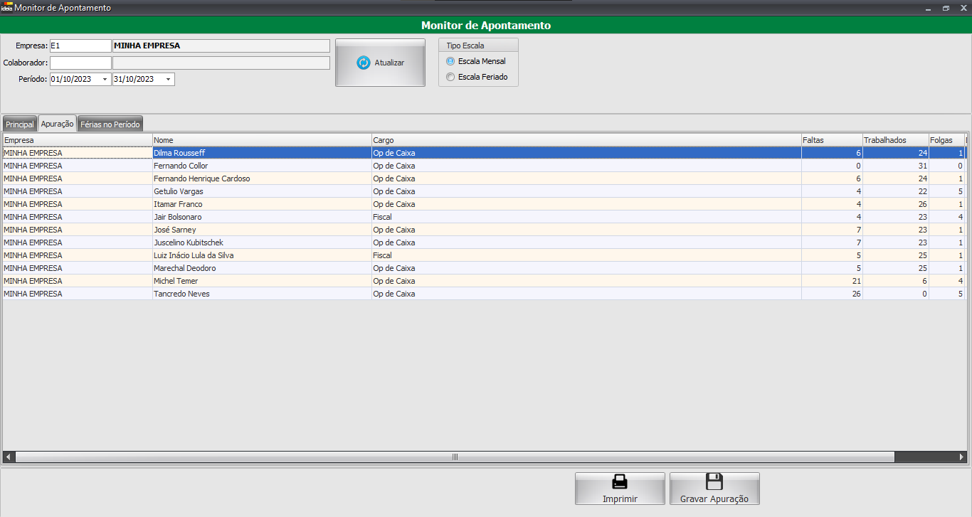 • Guia Apuração: Temos a apuração final com detalhes de faltas, dias trabalhados, folgas e dias escalado.
