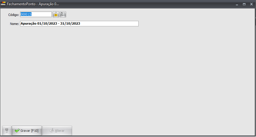 • Nome: Nome padrão gerado pelo sistema utilizando o período da apuração (podendo ser editado pela tela de “Fechamento Ponto”)