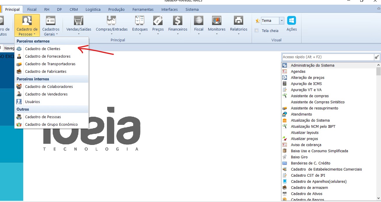 Para atribuir limite de crédito para clientes, primeiro vá até “clientes” em cadastros gerais.