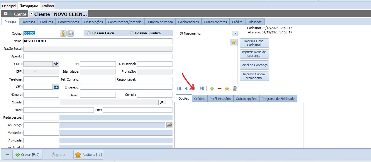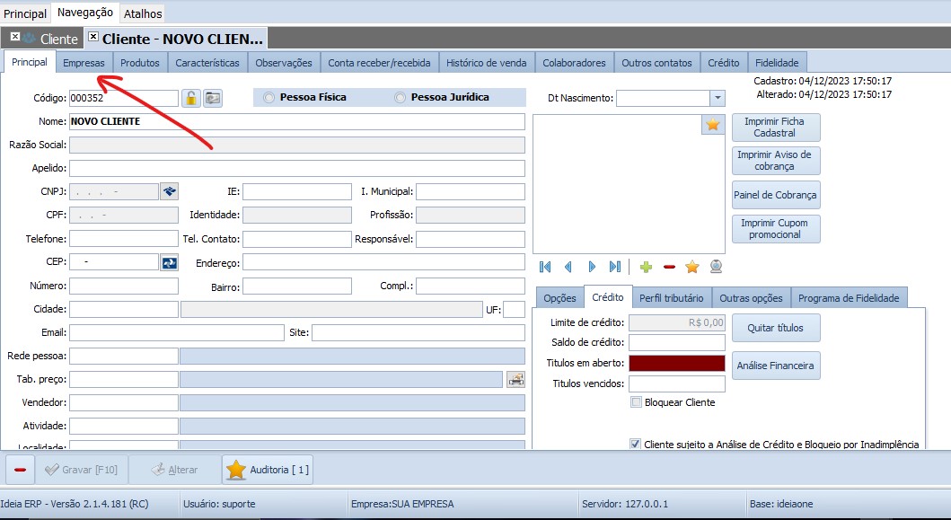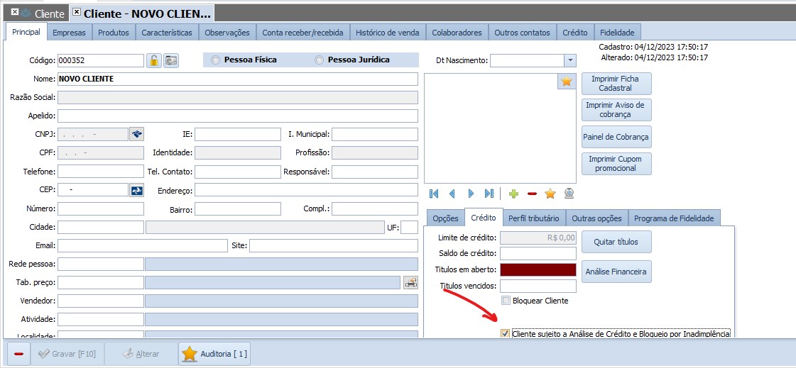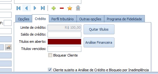Após acessar o cadastro do cliente navegue até a aba “crédito” e marque a opção “cliente sujeito a análise de crédito e bloqueio por inadimplência”