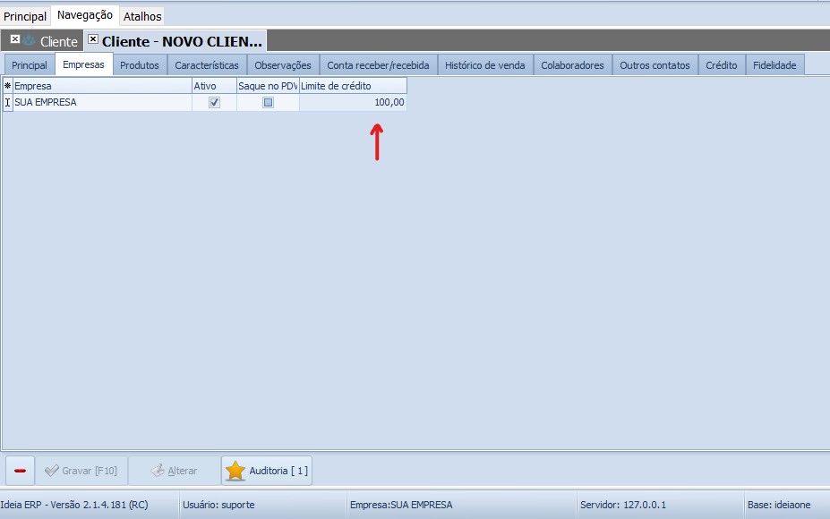 Feito isso, vá até a aba empresa e atribua o limite ao lado do nome da empresa.