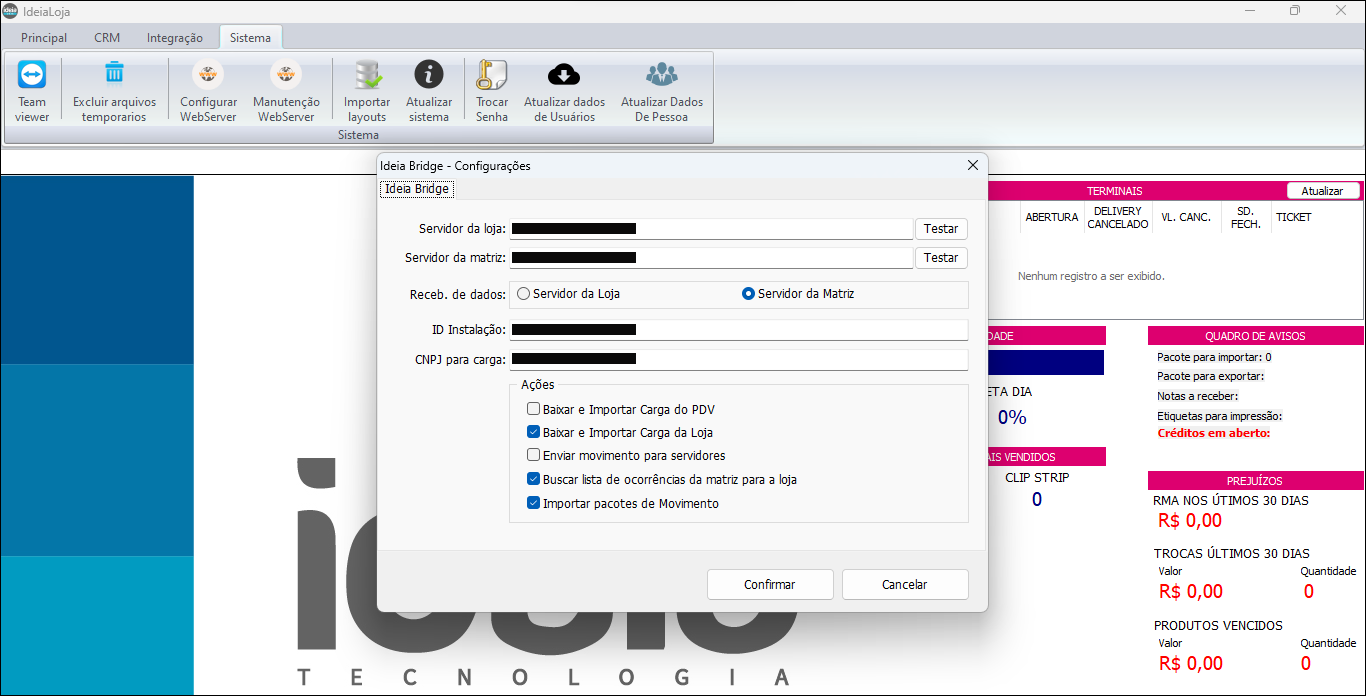 Nesta tela de configuração será solicitado o servidor da loja, servidor matriz, Receber De Dados, Id Instalação e CNPJ para carga.