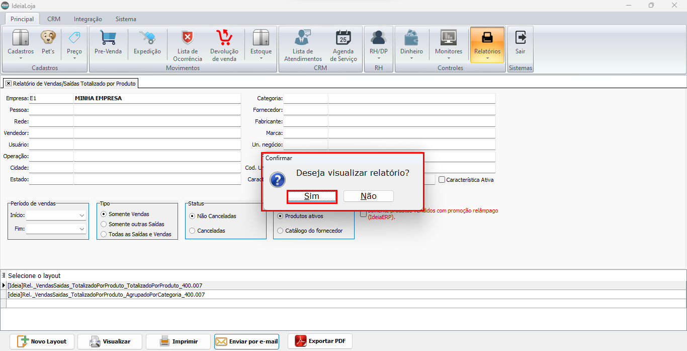 Ao clicar em enviar para o e-mail abrirá uma caixa de confirmação perguntando se deseja visualizar relatório.