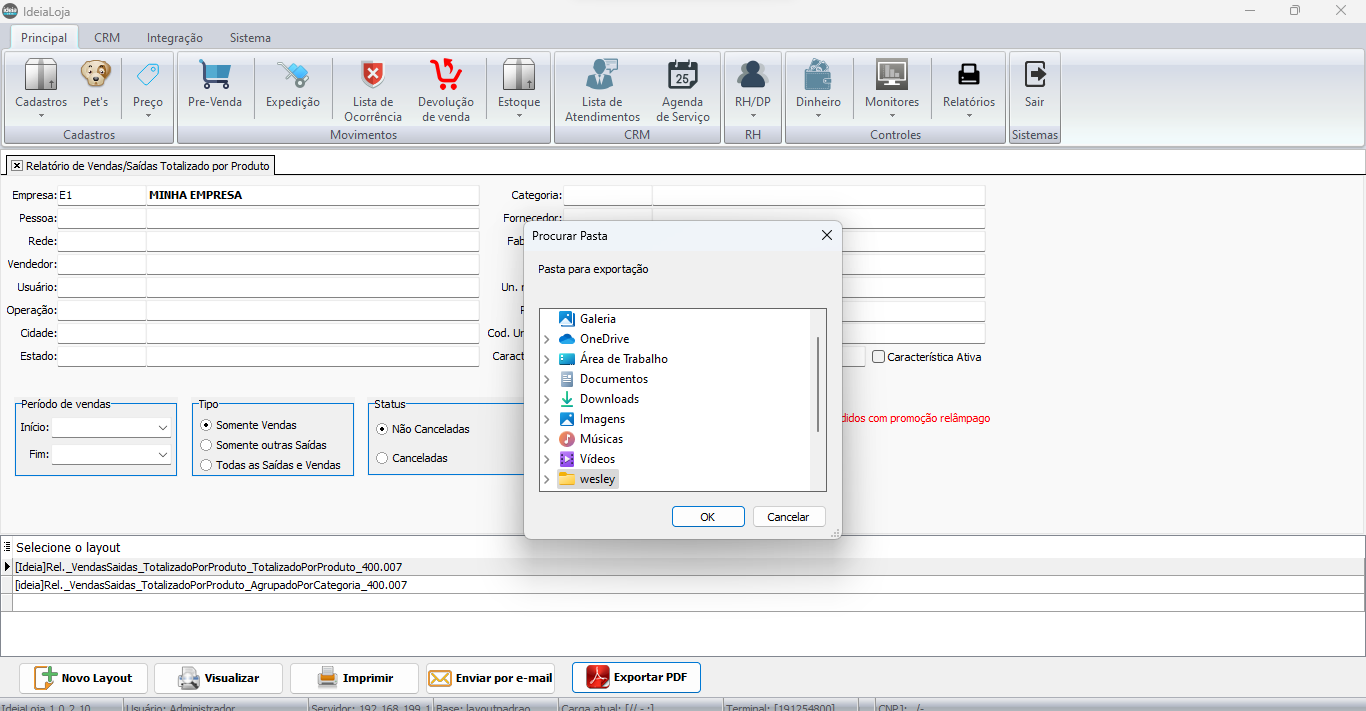 Clicando no ícone vermelho (exportar para PDF), será exibida a tela de procura de pasta. Nesta tela deve ser selecionado o local onde deseja salvar o arquivo PDF.