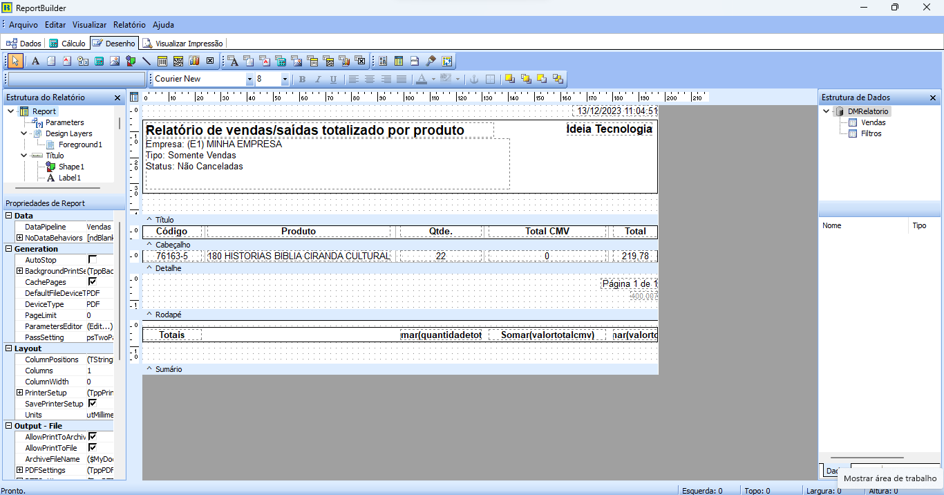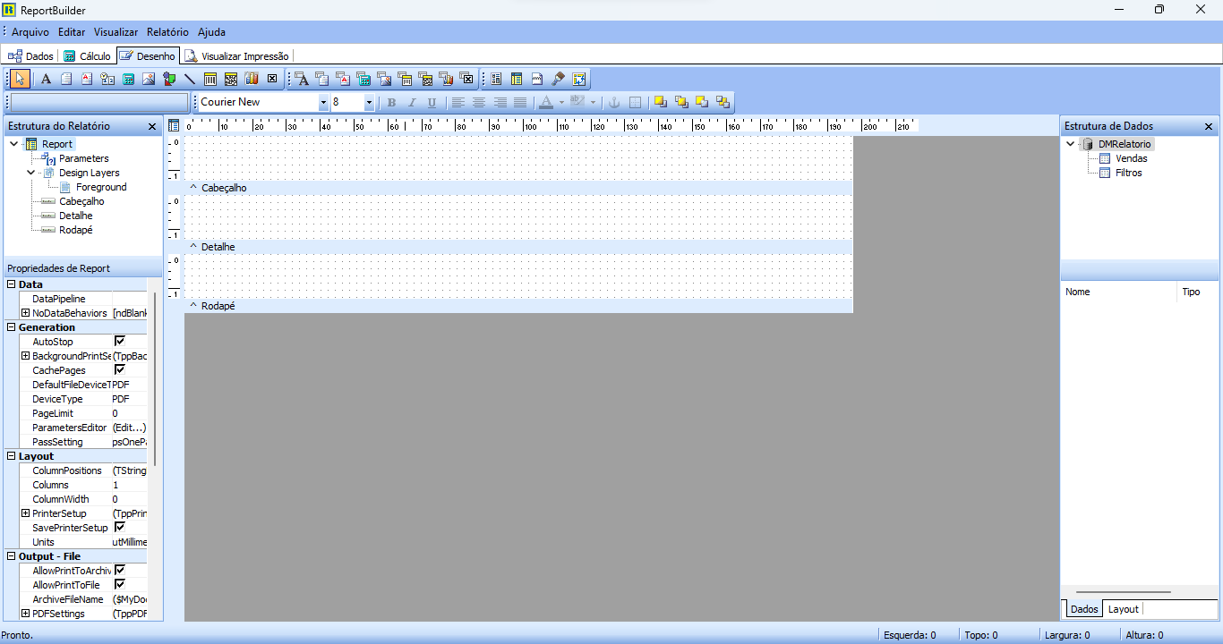 Nesta tela é exibida a área de criação de layout (ReportBuider) com os campos em branco.