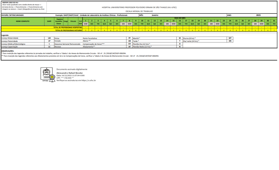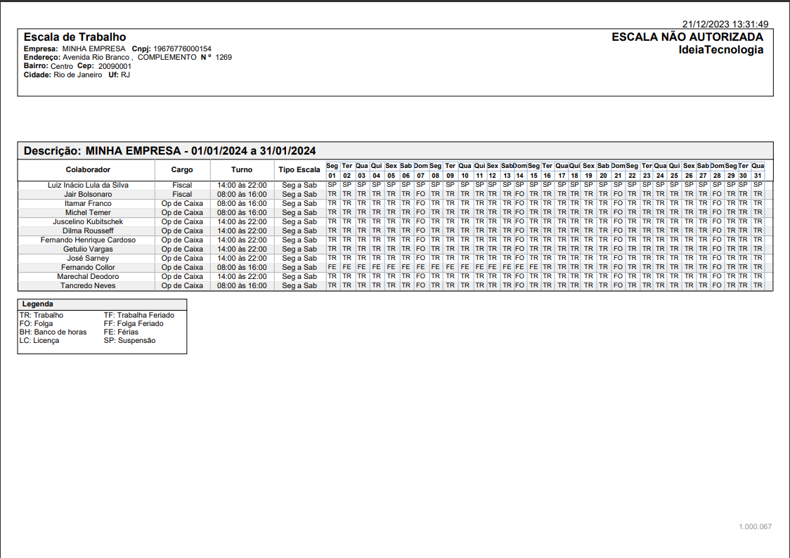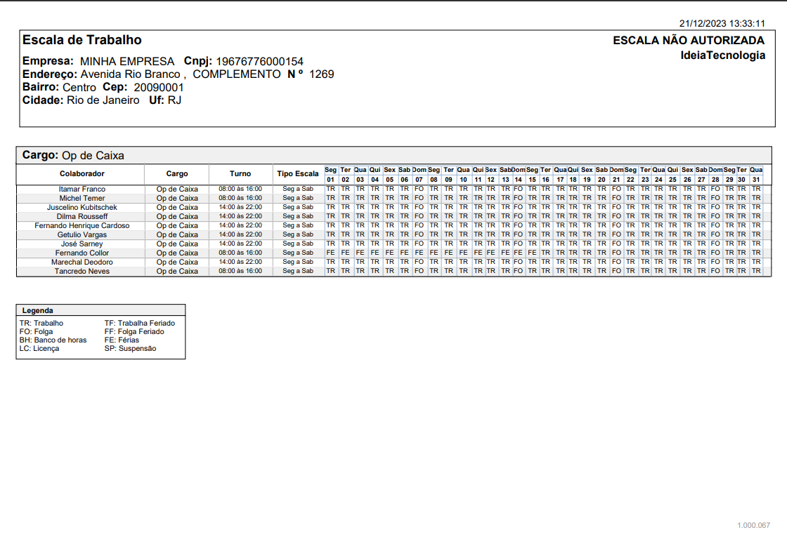 O atual padrão do de impressão de relatório de Escala de Serviço do Ideia atende exigências impostas pelo Ministerio do Trabalho, o relatório foi desenvolvido baseando-se no modelo que o governo utiliza como norma, abaixo os detalhes a respeito do modelo de layout.