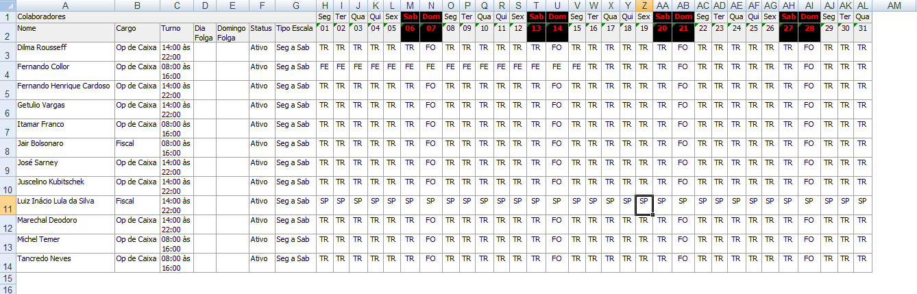 - Primeiro Modelo de Layout organizado Por Cargo: Nesse modelo podemos visualizar a escala organizada por cargo/setor em visualização impressão única.