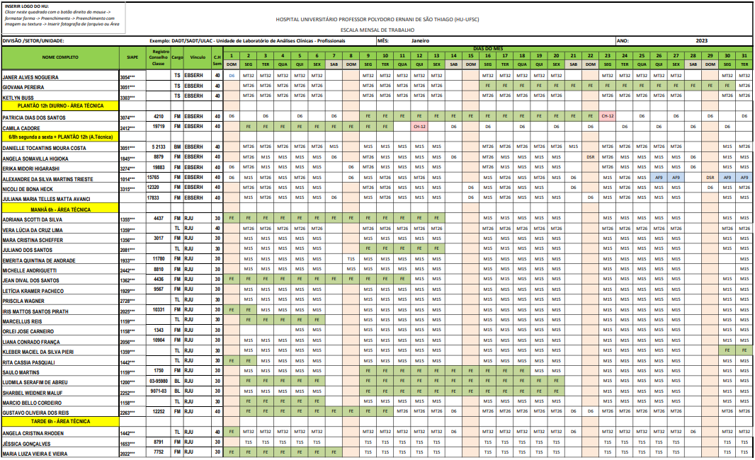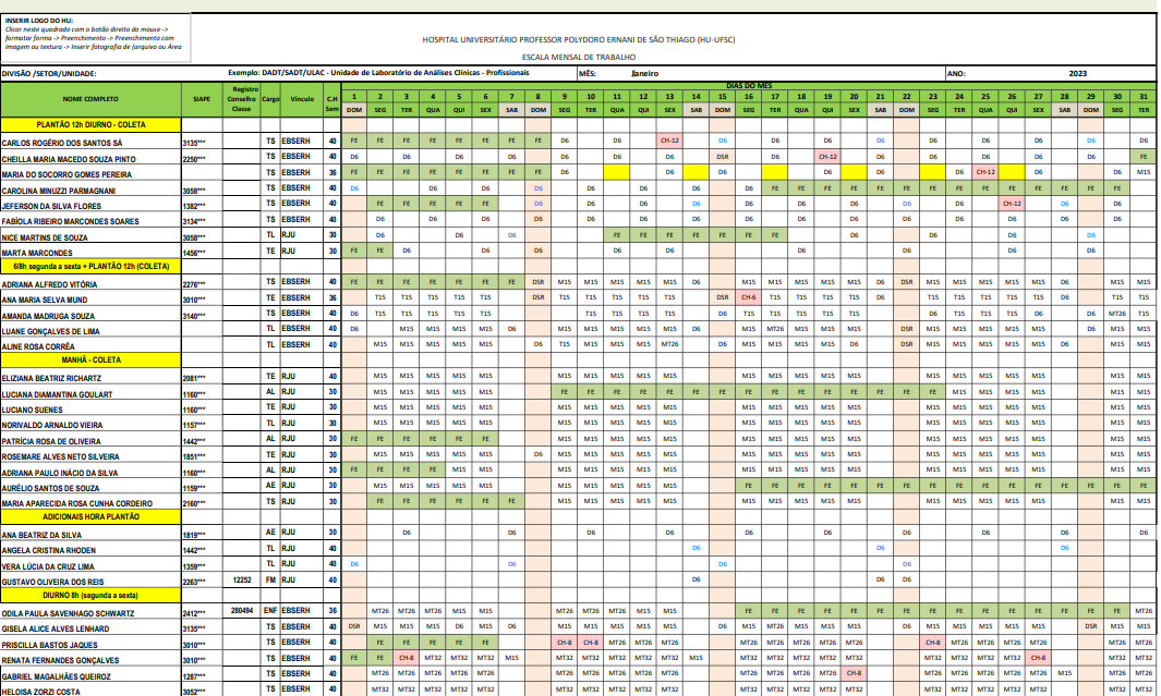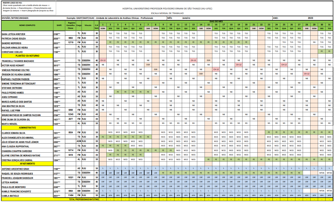 - Primeiro Modelo de Layout organizado Por Cargo: Nesse modelo podemos visualizar a escala organizada por cargo/setor em visualização impressão única.