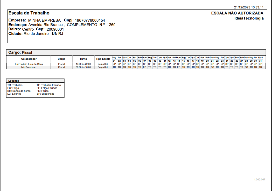 O atual padrão do de impressão de relatório de Escala de Serviço do Ideia atende exigências impostas pelo Ministerio do Trabalho, o relatório foi desenvolvido baseando-se no modelo que o governo utiliza como norma, abaixo os detalhes a respeito do modelo de layout.