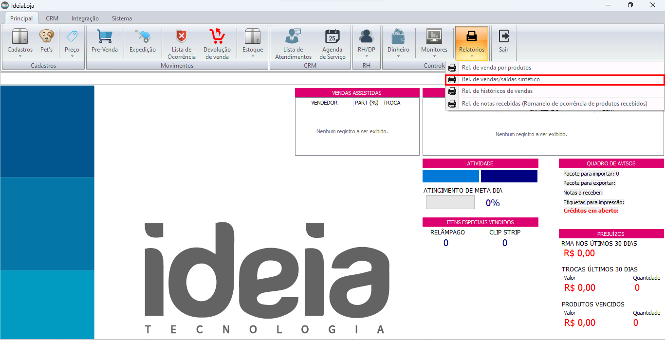 Para acessar o Relatório de vendas/saídas sintético vá em menu inicial → Relatórios →Relatório de vendas/saídas sintético.