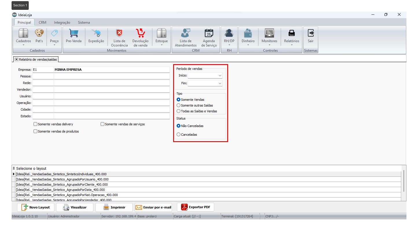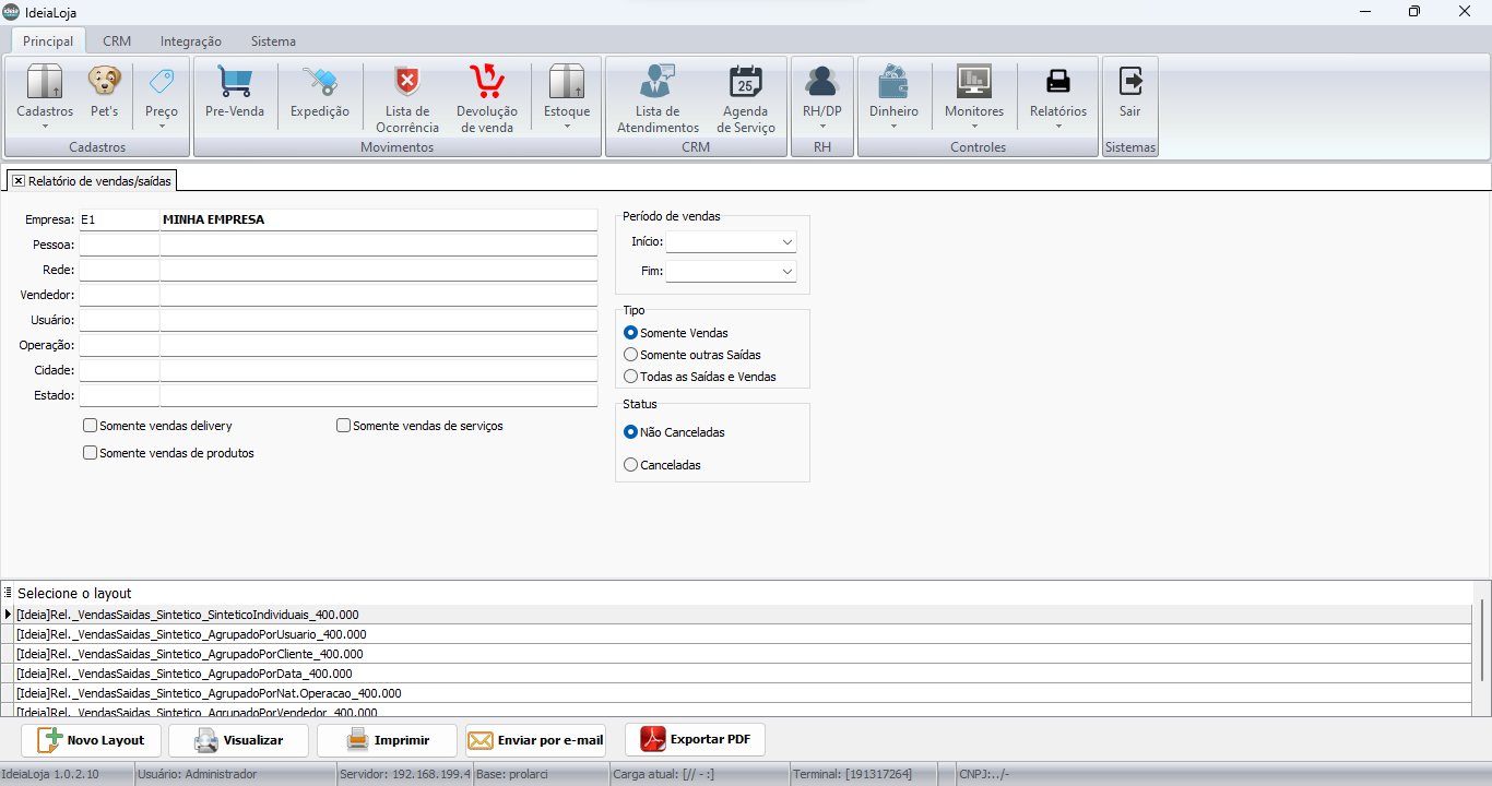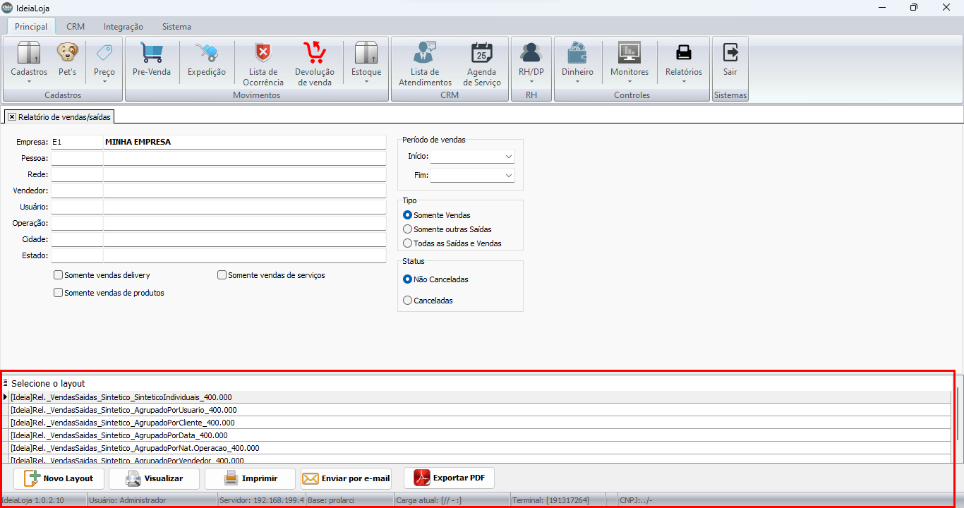 Abaixo ficam os layouts que podem ser selecionados, podendo ser adicionado um novo layout, visualizar, imprimir, enviar por E-mail ou exportar como PDF.