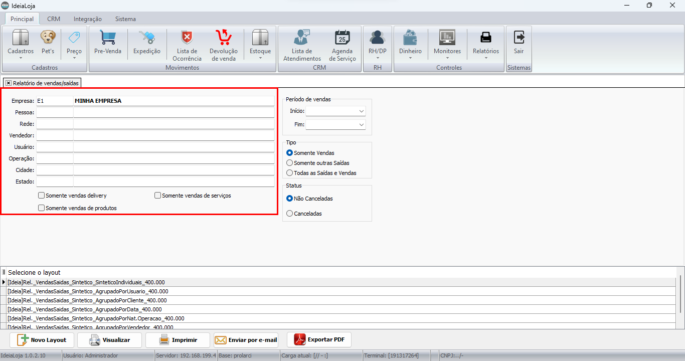 Após clicar em Relatório de vendas/saídas sintético será exibida a seguinte tela.