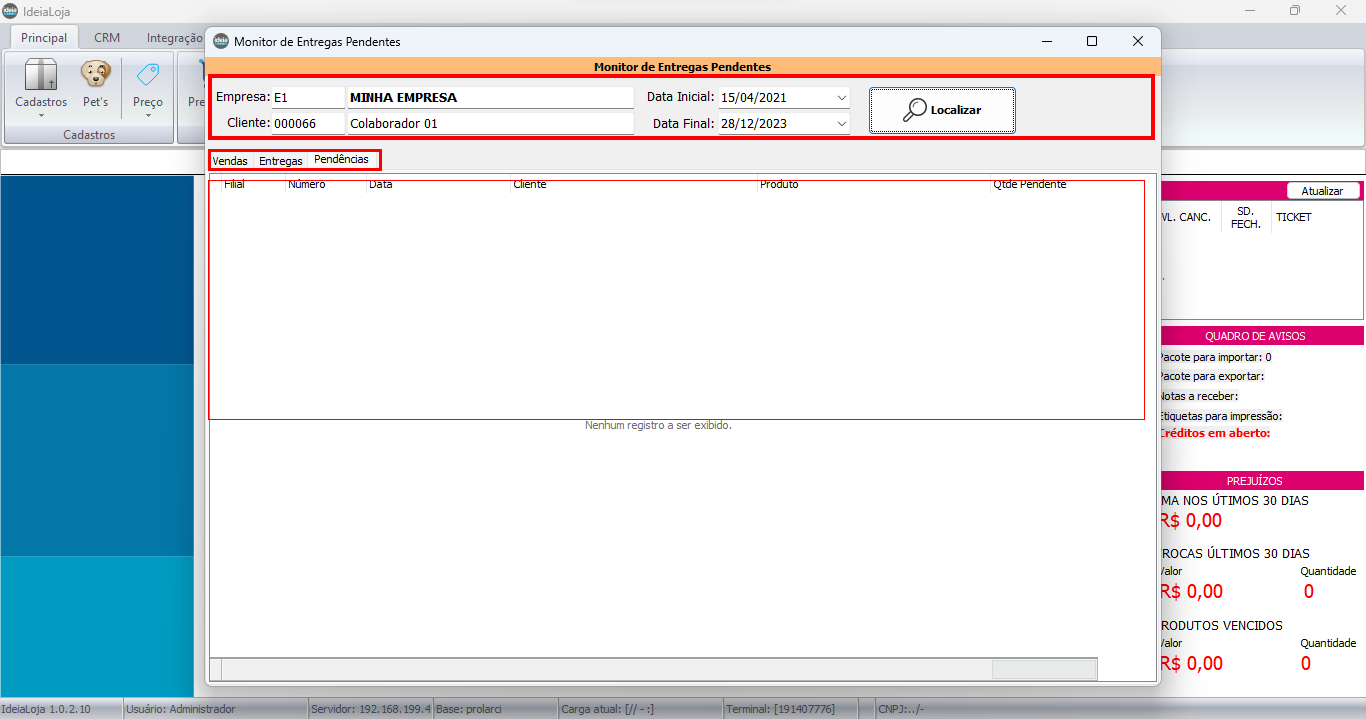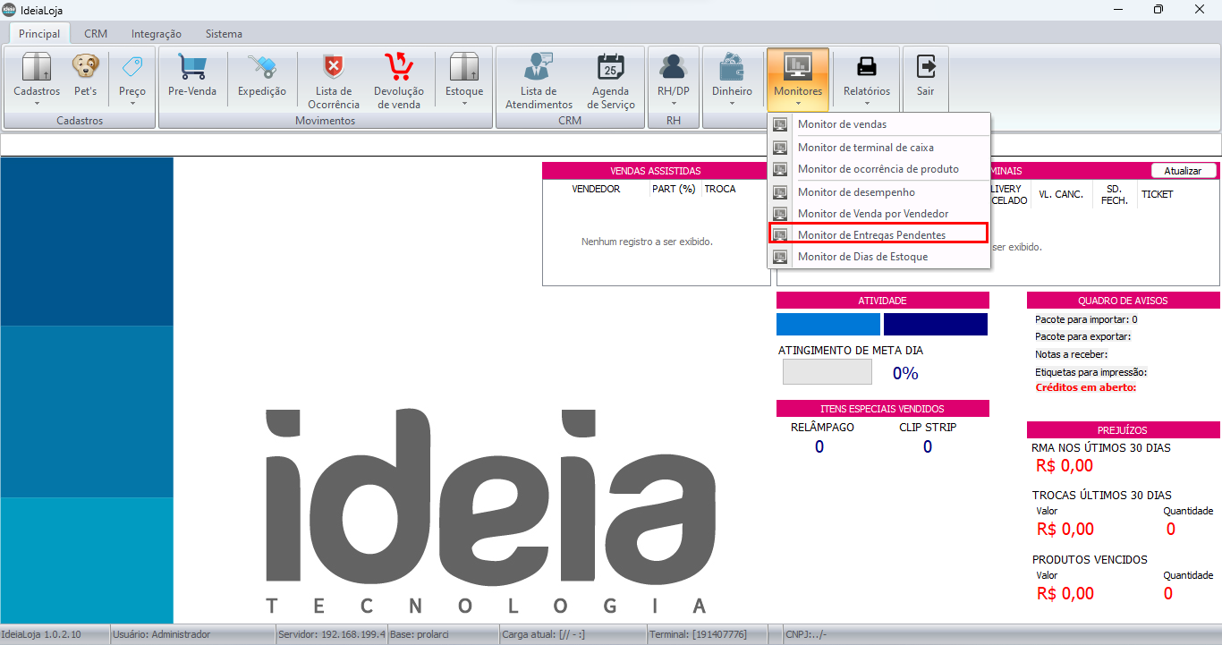 Para visualizar o Monitor de entregas pendentes vá em IdeiaLOJA → Monitores →Monitor de entregas pendentes