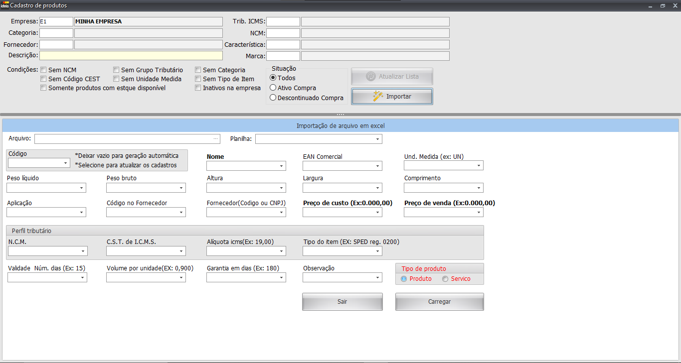A tela de manutenção de cadastro de produtos é utilizada para tarefas de organização e alterações dos seus registros de produtos, as alterações realizadas podem ser feitas de forma bem dinâmica e rápida. Para realizar a importação de produtos via planilha Excel.