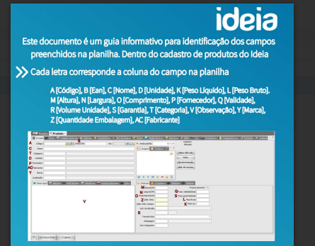 Este documento informará quais colunas informadas na planilha irão para determinado campo no cadastro de produto.