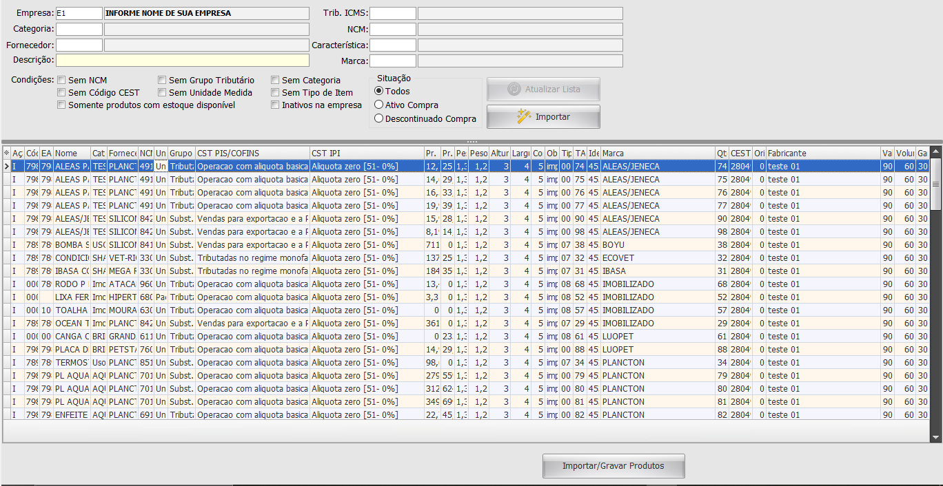 Observação: Após realizar as alterações e clicar em “Gravar” toda alteração aplicada se torna irreversível, exceto se seja alterado manualmente. Tenha atenção ao realizar tal importação.