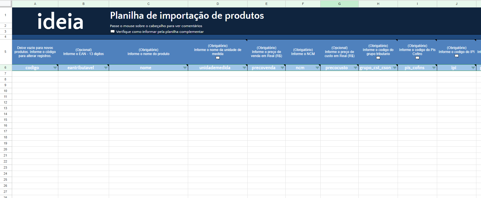 • Observação 2: Campos como Fornecedor, Categoria, Marca e Fabricante devem estar cadastrado previamente (antes da importação de produtos) para serem informados os seus respectivos códigos seguindo as orientações da planilha. Esses campos não são obrigatórios, podendo ser informados posterior a importação.