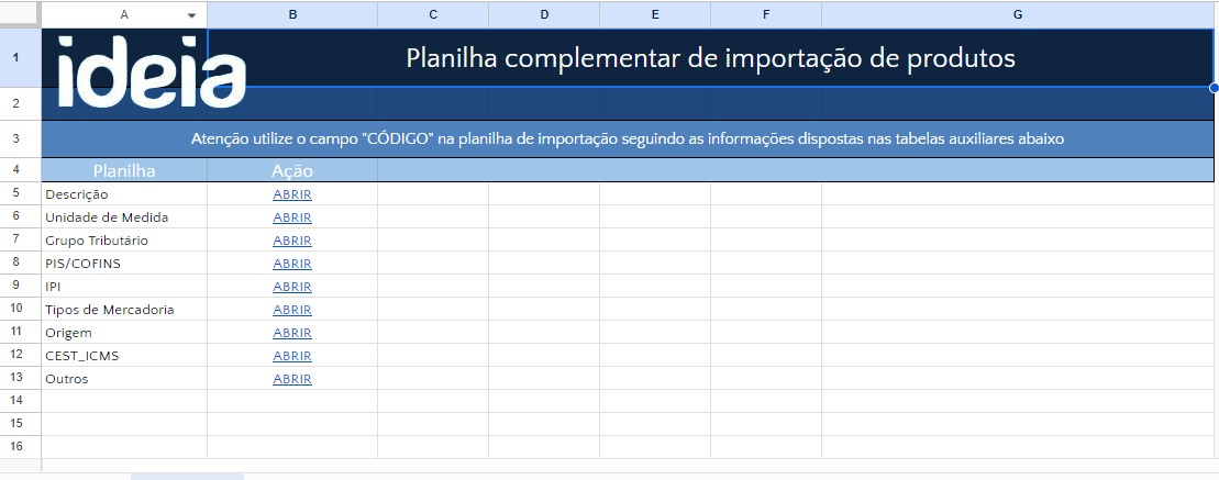 • Observação 1: Esses campos: Unidade de Medida, Grupo Tributário, Pis_Cofins, Ipi, Tipo de Mercadoria, Cest_Icms e Origem são necessários verificar a Planilha Complementar de Importação de Produtos. Pois o meio de informar o conteúdo é baseado no que está cadastrado no sistema.