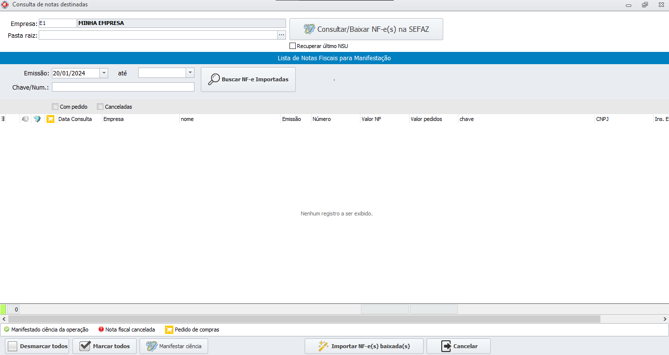 - Importar NF-e(s) baixados(s): Faz o download das NF-e disponíveis ou que já foram consultadas antes.
