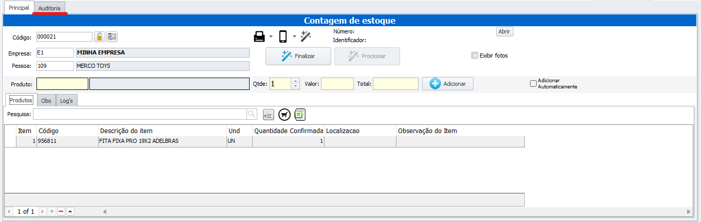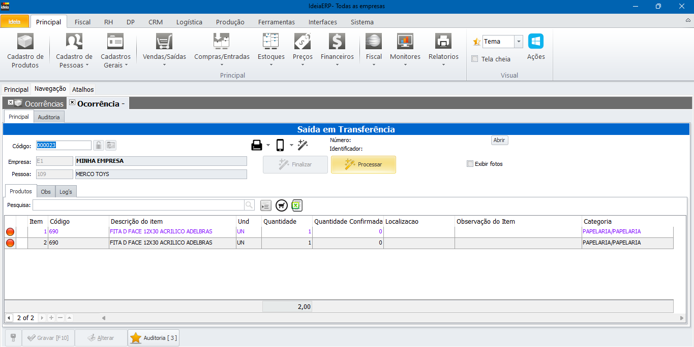 Após ter inserido os produtos e cadastrado a ocorrência da maneira desejada, clicando em