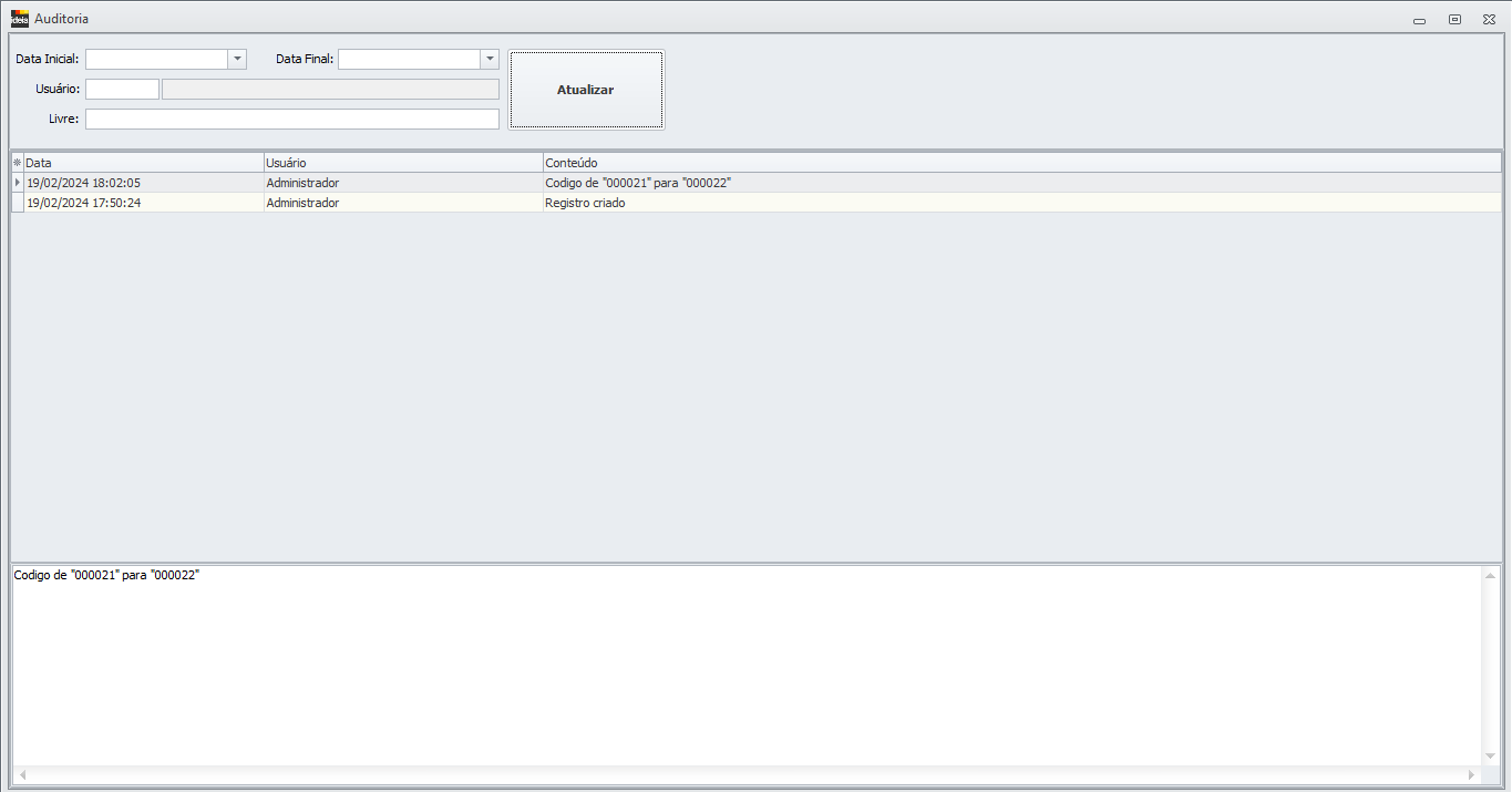 e será aberta a tela para filtrar período e usuário, caso não sejam filtrados nenhum campo, o sistema lhe retornará todas as alterações já feitas naquela ocorrência. Como no exemplo: