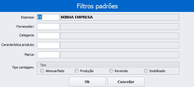 Onde o usuário pode filtrar os produtos de um determinado forncedor, categoria, característica, marca ou tipo de contagem. Ou até mesmo filtrar por todos os campos para uma busca mais precisa. Após selecionar os filtros desejados, basta clicar em Ok e os produtos serão retornados na área dos itens.