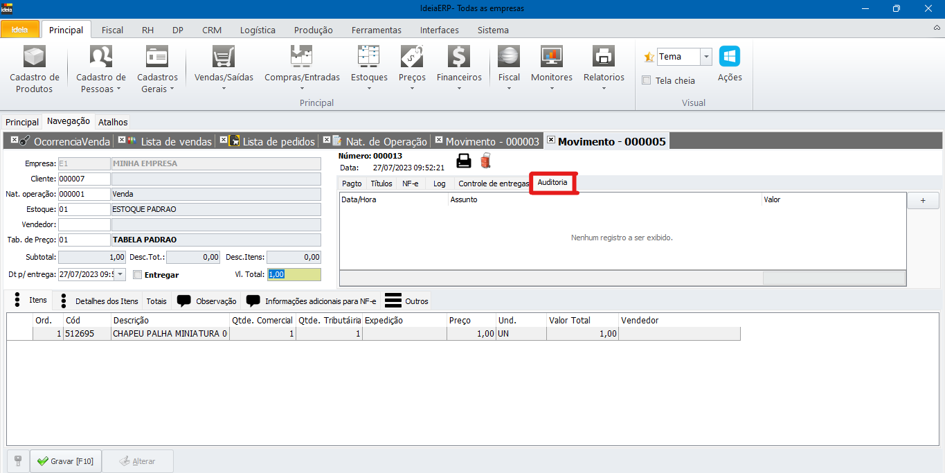 Esta tela serve para visualizar as auditorias geradas nas vendas. Caso não tenha nenhuma ocorrência, vá até a lista de vendas seguindo o seguinte caminho: