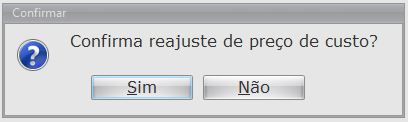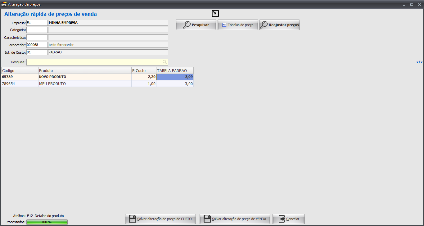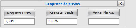 Exemplo: Um reajuste de 2,20% no preço de custo e um reajuste de 9,0% no preço de venda.