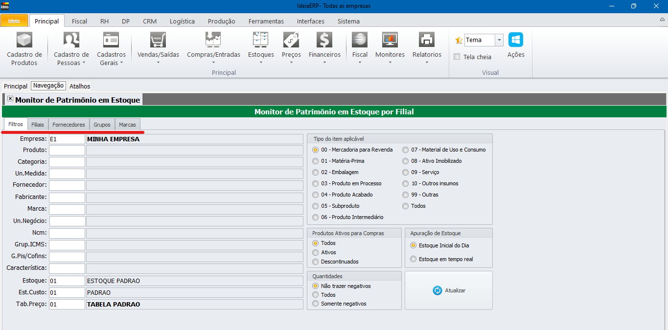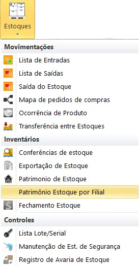 IdeiaERP → Estoques → Patrimonio de estoque por filial: