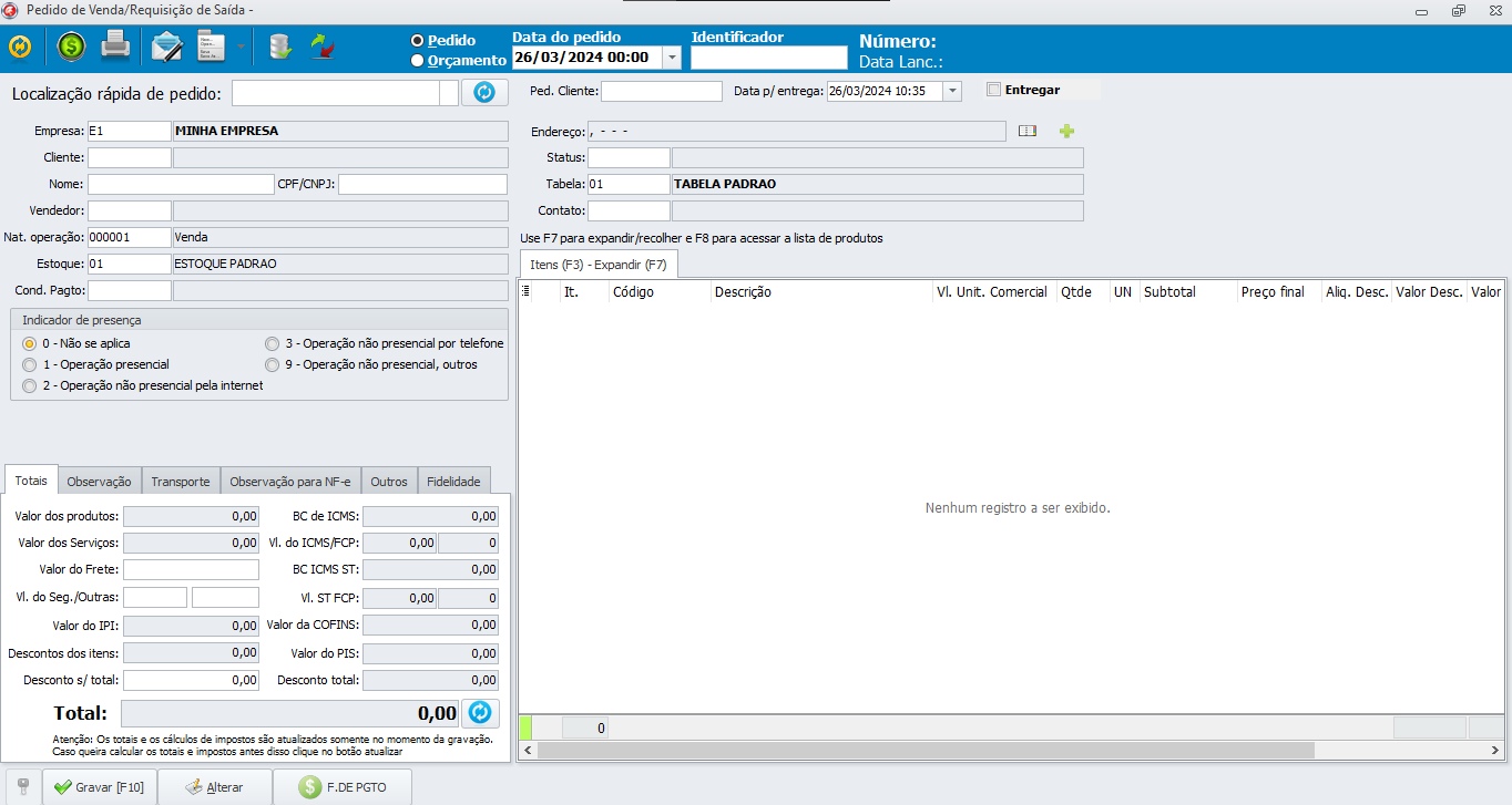 - Cliente: Selecione o cliente ou realize o cadastro através do atalho F3;