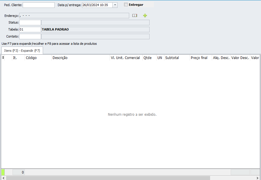 - Clique sobre o espaço em branco, use direcional seta para baixo para adicionar um novo registro ou tecla F8 para acessar a lista de produtos;