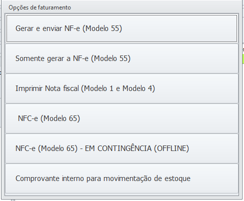 Selecione esta opção para faturar, abrirá as Opções de Faturamento.