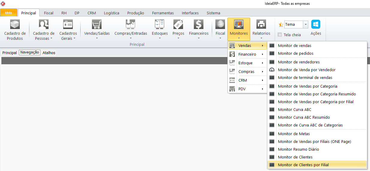 Caminho: IdeiaERP → Monitores → Vendas → Monitor de Clientes por filial