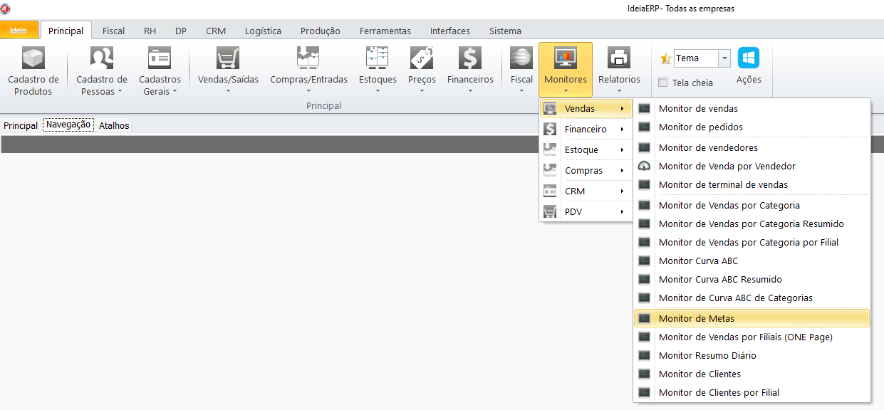 Caminho: IdeiaERP → Monitores → Vendas → Monitor de Metas