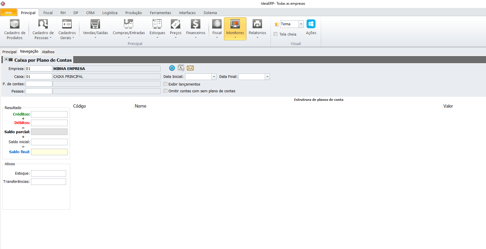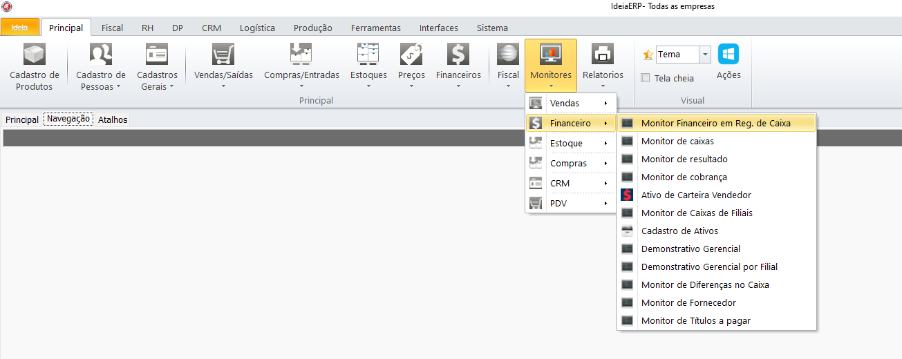 Caminho: IdeiaERP → Monitores → Financeiro → Monitor financeiro em Reg. de Caixa