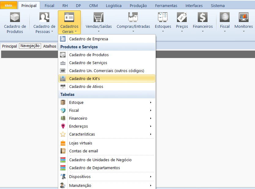 Na aba principal, você pode navegar até Cadastros Gerais > Cadastro de Kit’s.