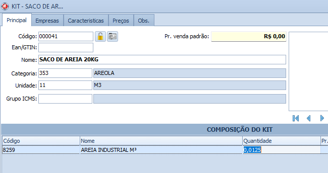 Feito isso podemos adicionar também o produto que formará o kit, que é o produto inicial(Areia m3).