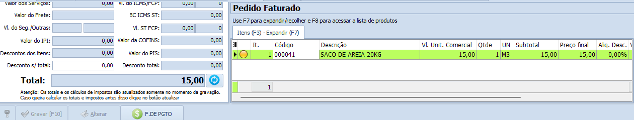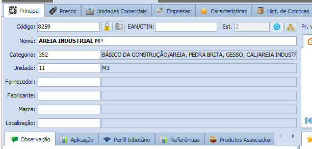 No nosso exemplo vamos utilizar Areia para construção, um detalhe é que essa areia é dada entrada no sistema como metro cúbico(m³).