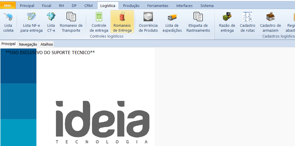 Para acessar a tela onde será feito o documento vá até a aba Logística, em seguida segure a tecla CTRL do seu teclado, e clique em romaneio de entrega.