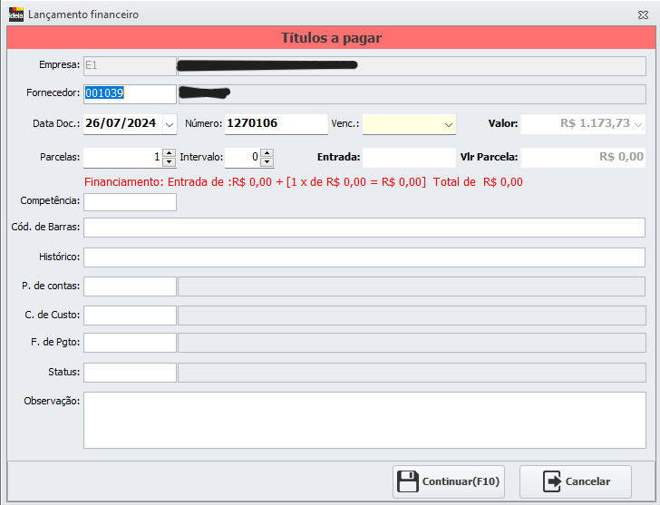 Forma de Pagamento: Coloque a forma de pagamento que será utilizada, podendo ser informada dentro do cadastro do fornecedor: Link do cadastro de fornecedor