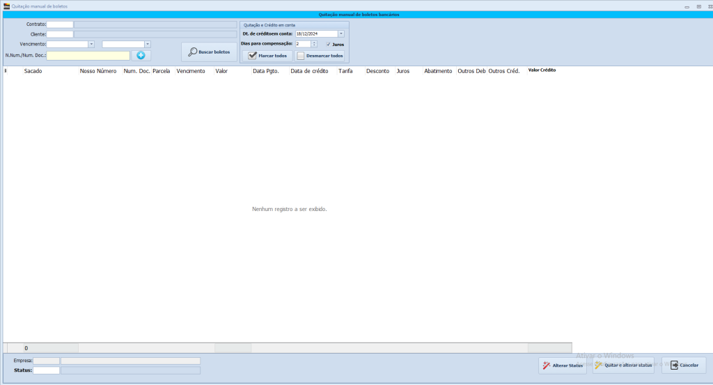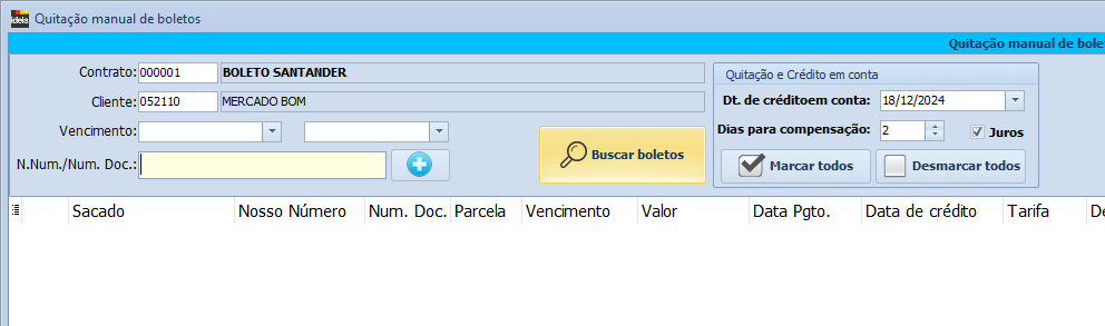 - Na tela Quitação Manual de Boletos, preencha os campos obrigatórios: