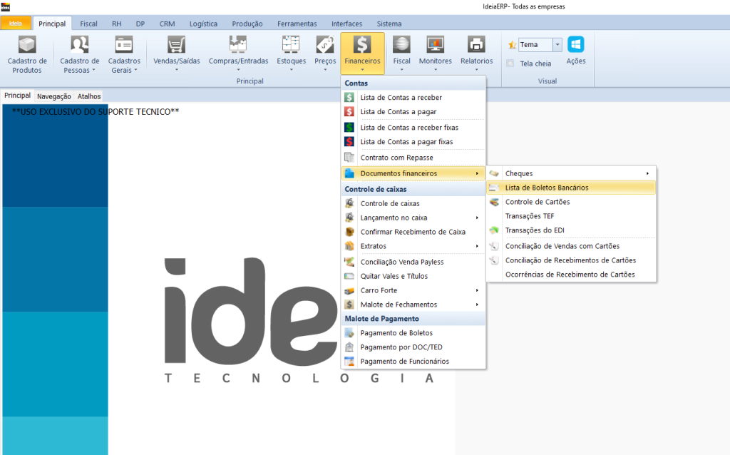 - Acesse o caminho: Principal – Documentos Financeiros – Lista de Boletos Bancários.