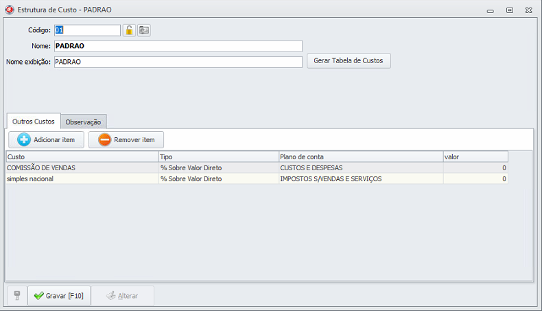 Estrutura de Custo (para cadastro/edição da estrutura de custo)