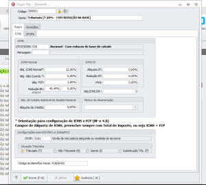 A aba Regra define o comportamento tributário padrão da empresa para o grupo de produto selecionado.